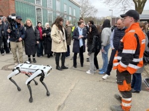 Am dritten Tag des diesjährigen BAUFESTivals im Hamburger Ausbildungszentrum-Bau hat sich die Senatorin für Wirtschaft, Arbeit und Innovation Dr. Melanie Leonhard über die Ausbildung in den Bauberufen informiert und wurde dabei von RTL Nord begleitet. Die Senatorin traute sich, einen Bagger und einen Baumaschinensimulator zu bedienen, traf einen Roboter-Hund, kam u.a. mit weiblichen Auszubildenden ins Gespräch und besuchte ausstellende Unternehmen.