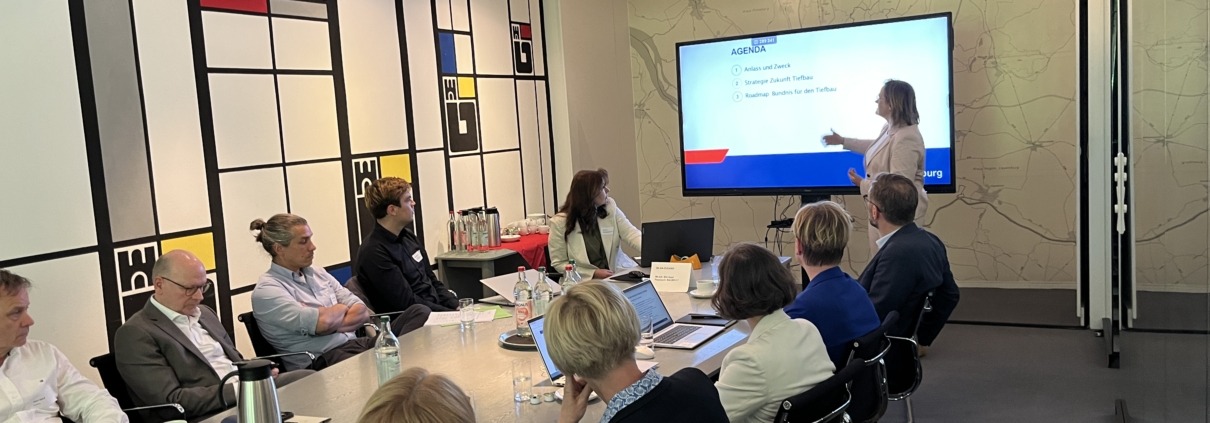 (Foto: Workshop am 12. Mai 2025 von Amtsleiterin Kirsten Pfaue und ihrem Team in der Hamburger Geschäftsstelle des Bauindustrieverbandes zusammen mit dem Fachausschuss Tiefbau)