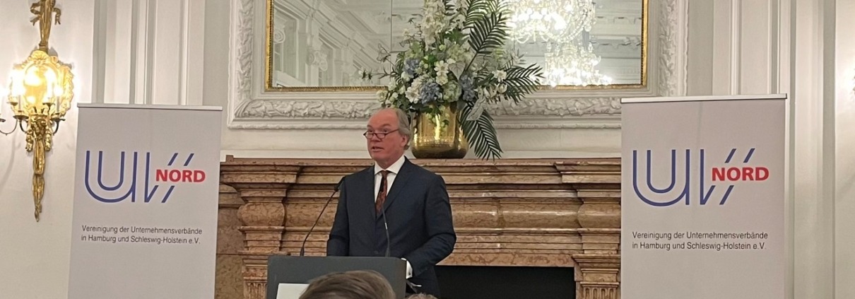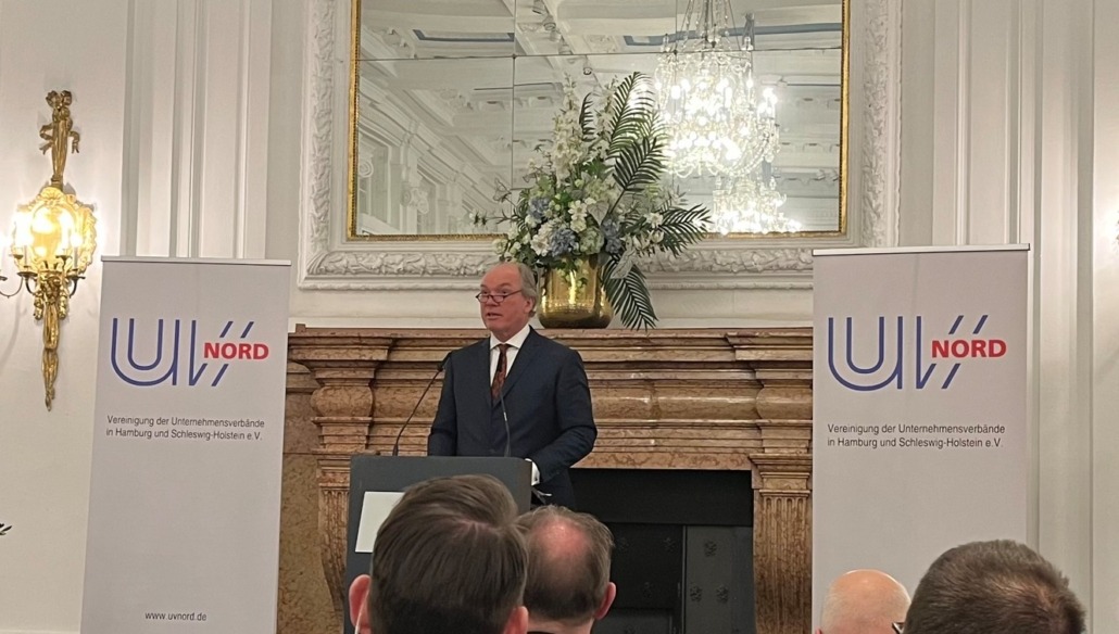 Mit einer Rekordbeteiligung von rund 650 geladenen Gästen aus allen Bereichen des öffentlichen Lebens, darunter auch unsere Hauptgeschäftsführerin Manja Biel, fand am 21. Januar der traditionelle UVNord-Neujahrsempfang im Hotel Atlantic statt. Hauptredner der Veranstaltung waren der Erste Bürgermeister der Freien und Hansestadt Hamburg Dr. Peter Tschentscher und der Ministerpräsident des Landes Schleswig-Holstein Daniel Günther, die zum Thema „Zur Perspektive Hamburgs und Schleswig-Holsteins in Deutschland und Europa“ sprachen. In Anwesenheit von weiteren Mitgliedern des Senats und der Landesregierung ging UVNord-Präsident Dr. Philipp Murmann mit deutlichen Worten auf die aktuellen wirtschaftspolitischen Herausforderungen ein.